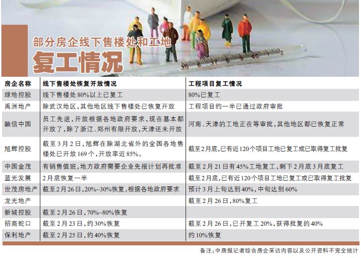 3月3日晚间,万科发布公告,其2020年2月公司实现合同销售金额280.3亿元,同比减少35.1%;前2月公司累计合同销售金额829.4亿元,同比减少9.92%。万科不是孤例。同日,中南建设、富力地产等房企也发布了2月销售业绩。中南建设2月单月销售额49.7亿元,同比减少38%,前2月累计销售额109.2亿元,同比减少35%;富力地产销售额下滑幅度更大,2月单月权益销售额25亿元,同比减少58.7%,前2月累计权益销售额86.8亿元,同比减少32.9%。大型房企尚且面临销售困境,中小房企生存势必更加艰难。从首创置业和景瑞控股两家房企公布的销售数据来看,其2月单月销售额分别为8.4亿元和3.21亿元,同比下跌幅度均超60%。截至3月4日,已发布2月销售数据的十家房企业绩普遍下跌。这也与机构所统计的百强房企前两月销售表现相一致。据克而瑞研究中心统计,百强房企于2月实现全口径销售金额3243.3亿元,环比下降43.8%,同比下降37.9%。2月的销售业绩创下近几年来单月销售的最低纪录。而从今年前2个月的累计销售金额来看,百强房企的销售规模同比下降23.8%。在百强房企中,仅有7家房企销售超百亿,九成房企2月业绩同比下跌。值得注意的是,面对着疫情的冲击,也有个别房企逆市而上,表现亮眼。比如恒大依靠线上营销,推出“网络卖房、千元认购”等营销手段,2月份实现460.7亿元销售额,同比增长106%。2020年前2月,恒大操盘销售额866.7亿元,超过万科、碧桂园。实际上,疫情暴发后,房企线下售楼处关闭,促使房企将销售延展到线上,通过自建平台或与第三方平台合作的方式搭建网上售楼处。但从目前销售数据来看,多数房企网上售房效果并不理想。在此前的采访中,禹洲集团副总裁张岩也提到,房地产毕竟是大宗交易,仅靠线上还不够,未来房企销售一定是线上和线下的组合牌。一方面,房企销售将至“冰点”,另一方面,随着疫情出现好转,各地政府均在鼓励复工复产,在此基调下,不少房企已经迫不及待将战场从线上转移到线下。早在2月15日,就累计有30多个省市发布了若干针对疫情期间企业复工管控工作的通知,要求各地在保障企业有序复工复产的基础上根据各城市疫情轻重及防疫安排做出不同的规定。比如,多地均明令复工需向属地政府提交复工申请备案,且制定一系列防控措施。深圳、重庆、天津、成都、西安、昆明、南京、杭州、福州、中山等地均出台通知明确企业复工复产须在制定好复工方案后向属地政府申报备案,有关部门审批合格后方可复工。中国房地产报记者了解到,在2月底就已经有部分企业开始陆续恢复开放线下售楼处,截至3月4日,在记者采访的十家房企中,至少一半房企线下售楼处开放比例已经达到80%。受访企业均表示,线下售楼处恢复开放需要符合各地政府要求。以上海一项目为例,据项目负责人向记者介绍,该项目售楼处恢复开放需向当地所在区房管局报备,且需每日报备《售楼处复工情况表》;同样是该公司在苏州的项目,要求在具备条件的前提下,提前2天以电子文档形式向所在街道提交复工备案材料,备案审核通过后方可复工。“除了政府要求的相关材料和准备措施外,公司内部也有严格的复工管理要求,员工情况每日每人严格登记,进入办公区域前两道测温登记流程,办公区域也是采用了多重防护措施,包括分散会议、随处免洗消杀、分餐打包等。”上述负责人表示。在所统计的房企中,绿地集团线下售楼处恢复比例较高,在2月27日时,绿地线下售楼处已有超过80%恢复开放。“售楼处恢复开放,防疫措施肯定要做全套,隔离、测量体温、消毒、人数控制等。”绿地集团相关人士表示,售楼处复工包含两个概念,如果是指营销人员到岗,这个复工时间更早,但真正开展接待客户看房,尤其是集中开盘,目前肯定还不行。尤其是核心城市和人口密集城市,对于线下售楼处恢复开放的管控更加严格,也出台了一些特殊政策,比如深圳、上海、佛山均倡导商品房项目售楼部“有限度”开放使用,分期分批销售、控制现场人数等。对此,不少房企重开售楼处后采取预约看房、“一对一”带看等特殊服务。以禹洲地产为例,在恢复开放的售楼处实行错峰看房,要求各案场营销负责人,做好分时段预约对接客户工作,分时段看房。虽然目前房企线下售楼处在逐渐恢复正常,但受疫情影响,购房者热情并不高涨,实际转化率也有待验证。“自从区域开通线上售展中心后,一个月累计客户2000余组,但目前尚无法统计转化率。”上述区域相关人员表示。除了线下售楼处恢复开放,房企也在推进建筑工地、工程等有序复工。旭辉控股表示,截至2月底,已有近120个项目工地已复工或已取得复工批复;禹洲地产也表示旗下工程项目约一半已通过审批;融信集团除了河南、天津两地,其他地区项目工地基本已恢复正常。“河南、天津两地的工地正在等待审批,但是工人已到岗,等审批通过就可开工。”融信集团表示。在采访企业中,绿地控股的工地复工率超过80%。上述绿地相关人员也表示,因为绿地旗下大多是综合性项目,属于重大工程,而现在各地政府鼓励复工复产,所以项目复工进度要明显快于售楼处开放。但同时,其也指出,外地工人能否按时到岗、建材等上下游产业链是否能跟上供应等也是工程复工的制约因素。智联招聘《春季求职竞争周报(2月24日——2月28日)》数据显示,复工一个月以来,随着企业实际复工比例的逐步