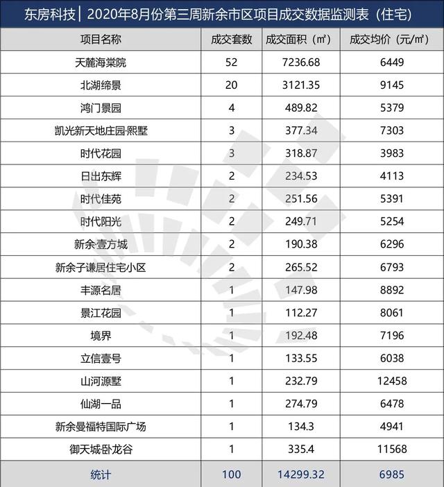 东房科技2020年8月份第三周新余市区项目成交数据监测表(住宅),为你公布如下: