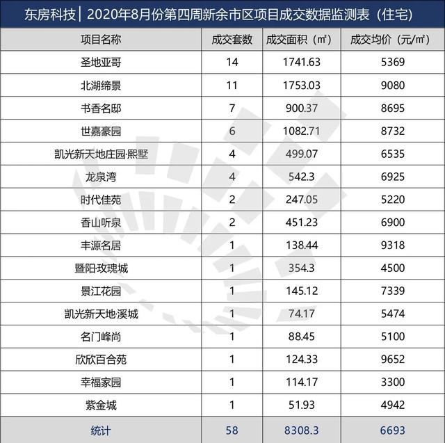 东房科技2020年8月份第四周新余市区项目成交数据监测表(住宅),为你公布如下: