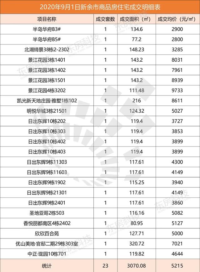 2020年9月1日新余中心城区各楼盘商品房住宅成交明细表,东房科技为你公布如下: