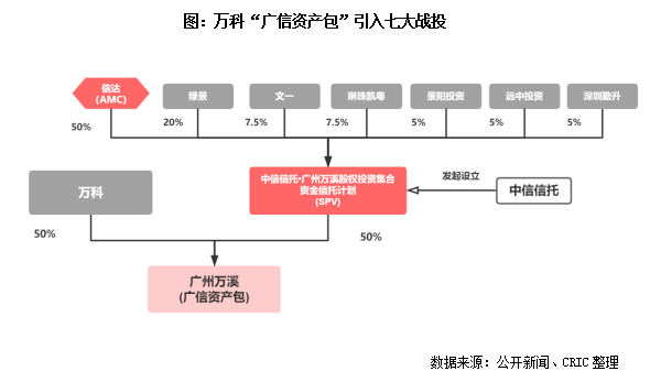 具体来看,万科的全资子公司广州万溪(广信资产包)以70.4亿元的价格转让50%的权益给“中信信托·广州万溪股权投资集合资金信托计划”,引入以信达为首的七家战略投资者,同时收回前期向广州万溪提供的股东投入320亿元,整体回笼资金390.4亿元。交易完成后,万科和绿景负责广信资产包的整理与开发,其他五位战投充当财务投资者。而信达收购广信资产包25%的权益,将进行债务重组、追加投资来盘活不良资产,同时作为战投提供资金的同时,能按照股权比例获得相应的经营收益。