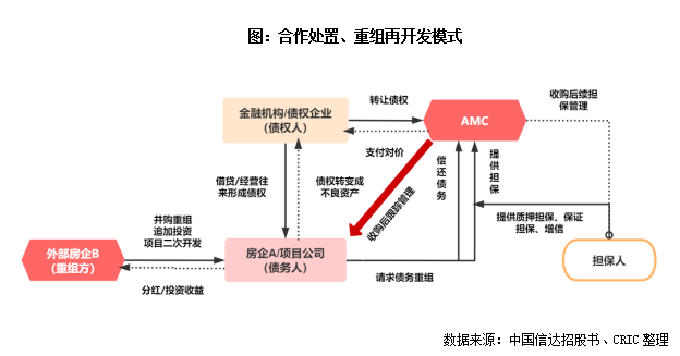 另一方面,房企在并购案中引入AMC,借助AMC进行标的项目的债务梳理及提供资金支持等。其中,“不良资产处置、重组、再开发”模式是房企与AMC合作最主流的合作模式,该模式下,AMC负责不良资产的处置和重组,而房企作为重组方负责再开发和运营。具体操作上,AMC收购问题房企或问题项目的不良资产后,作为牵头人,对不良债权进行谈判,对债务偿还金额、期限、利率和方式等进行重组,再引入头部房企作为重组方,产权及股权转移至房企,共同参与追加投资、债务重组、跟踪管理,使得问题项目的不良转为正常。期间,房企凭借其地产开发运营能力,对问题项目进行改造、再开发,进而推向市场变现,双方各自获得相应的收益。