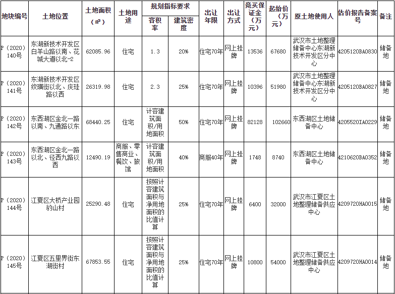 据土地情报监测,武汉市国有建设用地使用权交易网11月13日公告 武告字(2020年)22号显示,武汉市自然资源和规划局以挂牌(包括现场挂牌和网上挂牌)方式出让14宗地块的国有建设用地使用权。其中,住宅用地9宗,P(2020)140号、P(2020)141号、P(2020)142号、P(2020)144号、P(2020)145号、P(2020)146号、P(2020)147号、P(2020)148号、P(2020)149号;综合用地(含住宅)3宗,P(2020)150号、P(2020)152号、P(2020)153号;商业/办公用地2宗,商业/办公用地2宗,P(2020)143号、P(2020)151号。