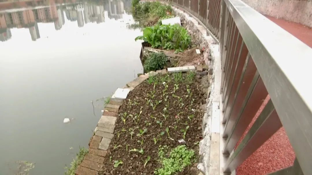 几百米长的供市民休闲散步的游步道边被种上了各式蔬菜,河道上也有人用砖石圈出了一块块菜地。