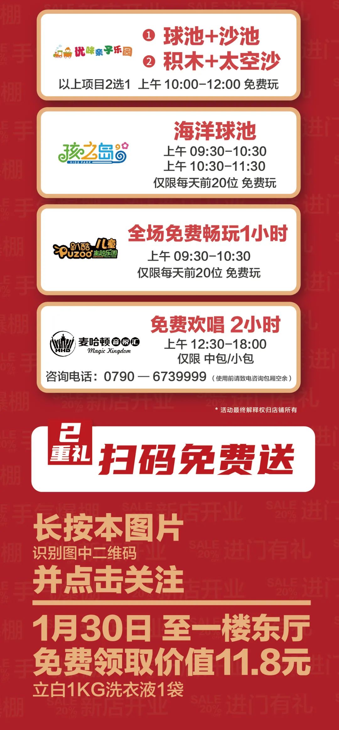 免责声明:我司承诺遵守国家知识产权相关法律法规规定,尊重作者版权。本文中部分图片、素材源于网络,无法核实真实出处,为保护原作者权益,如涉及非授权使用,请原作者联系,我们将支付稿酬或进行删除处理。以上活动所有券种、奖品、商品数量有限,先到先得,领完即止;券具体使用规则详见券详情页以及店铺公示;促销折扣活动详询店铺,分类仅供参考;活动内容如有变化,以活动期间新余广富城购物中心告示或门店信息为准,恕不另行通知。