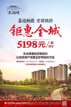 8月16日-8月31日,海纳天润阁购房大事件特价风暴来袭,海纳天润阁营销中心推出“天润阁礼动全城,特惠团购第二季”促销活动,喜迎新政,特价风暴来袭,房价触底回馈,低价格一步到位,打造新余最强力度、最震撼、最任性的特惠团购季活动!